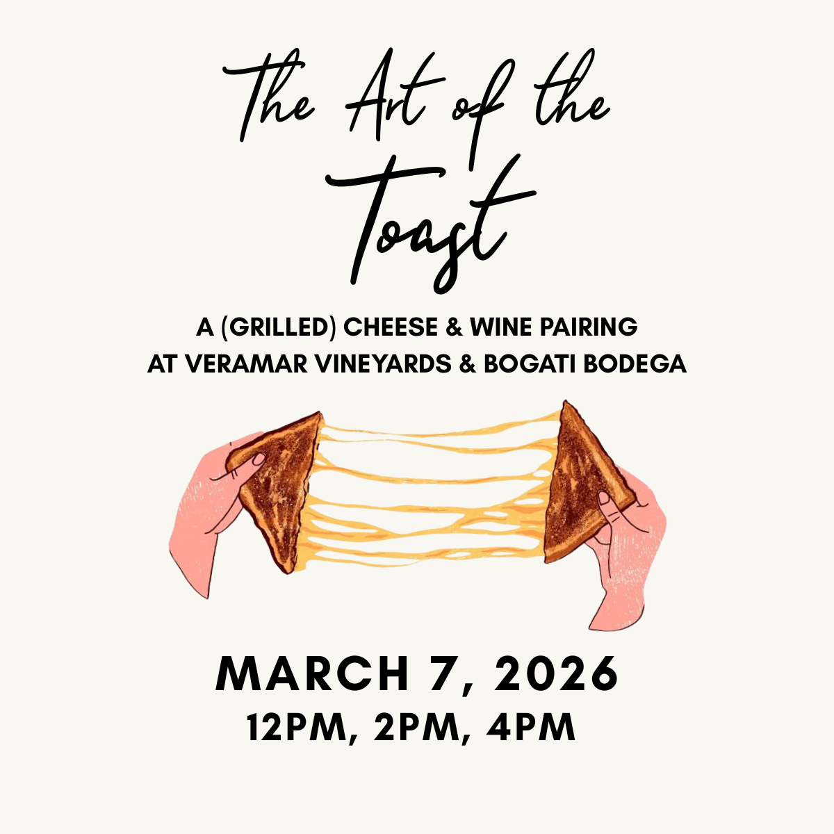 The Art of the Toast: A Grilled Cheese & Wine PairingSaturday, March 7Β Time Slots: 12 PM β’ 2 PM β’ 4 PM (4 tickets per session) Warm up from the...